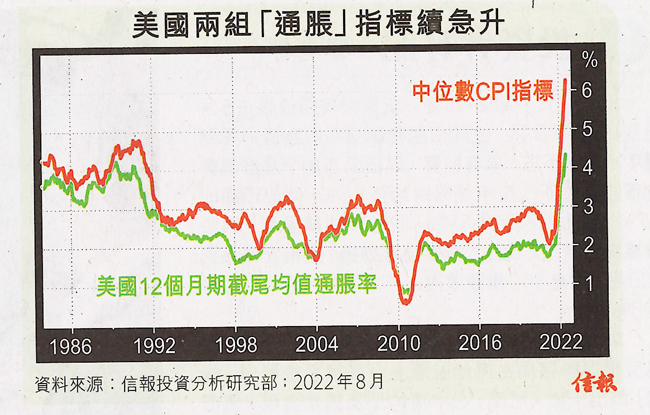事實上,克利夫蘭聯儲銀行編製的中位數CPI指標(Median CPI)顯示,7月份按年升幅為 6.27%,是1983年有紀錄迄今最高,且 連續12個月向上。與傳統CPI透過各分項加權平均計算不同,中位 數CPI主要量度分類中位數變化,可有效地剔除較易呈短線波動的分項,7月數字高企,足證通脹難言回調。
