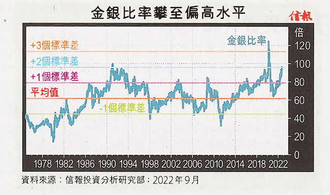 值得留意的是,工業金屬白銀於今年3月觸及每盎斯26.4059美元便無以為繼,8月底更失守18美元關,一樣跌逾三成;然而,金價暫時企穩每盎斯1700美元水平,同期回吐幅度僅16.57%。「金銀比率」因此再次升至異常偏高位置。