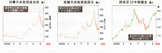 不單止天然氣價格,在能源危機進—步消減背景下,歐洲國債孳息周一晚急插。觀乎10年期債息,意大利下滑796個點子;德國也跌470個點子,西班牙急挫707個點子,周二則報2.845厘,回升1.7%【圖3】。歐盟的干預其實有更深層次戰略意義,皆因近周普京政府不斷以切斷供歐天然氣作為威脅,以能源威嚇作為最後一道板斧,現在這—最後手段都已經無效。