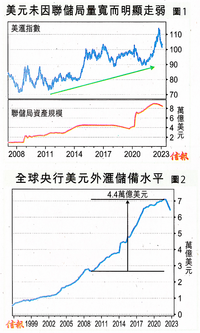 有趣的是,聯儲局15年來不斷印銀紙(QE),美元期內整體大趨勢卻不跌反升, 即美元「愈印錢、愈值錢」,尤其在每次QE後期及結束後,走勢更加堅挺 (圖1)。箇中原因, 除了美國宏觀經濟表現較歐日強 (匯價某程度反映兩個國家宏觀經濟相對表現),以及主要央行尤其歐洲和日本跟隨聯儲局推出QE,在齊齊印鈔下消減了美元貶值壓力外,還有兩個更重要的原因,就是與美元作為全球主要外滙儲備和借貸貨幣有莫大關係。