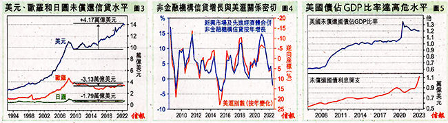 換句話説, 聯儲局QE期間,美元信貸需求增加, 導致大量美元流向新興市場及其他先進國家, 間接令美元承受一定的歷力, 但部分壓力因QE帶動資金吸納美元資產(如買美股),以及新興市場央行強化外儲產生的美元需求所緩和。反之,當聯儲局完成QE甚至開始QT,美元海外信貸便出現收縮壓力, 即去槓桿 (deleverage) , 因而在償債過程產生美元淨需求,美元滙價便在這環境下趨升。這某程度也解釋了為何聯儲局每次完成QE後,美元都出現明顯升浪。簡言之, 聯儲局「愈量寬、美元愈升」異象, 某程度是因為美元得天獨厚擔當主要外儲和國際貿易貨幣的角色所致。然而,這「美元紅利」因素卻隨着美國政府多年來揮霍無度,聯儲局無節制印鈔,令未償還國債已攀升至31.4萬億美元(現在美國國會正討論再調高債務上限),相當於經濟規模1.2倍的高危水平【圖5】,僅是每年利息開支超過1.1萬億美元新高。