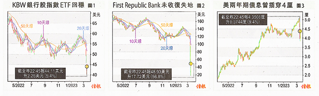 美國政府周一公布的緊急救市措施,一度令亞洲市場鬆一口氣, 殊不知當天晚上去到美市,投資者竟然繼續大舉拋售地區銀行股票, 反映這類股份表現的ETF 急插近12%,多家傳聞有風險的地區銀行股價也暴跌。如此情況代表存戶已經失去信心,大舉從這些有風險的銀行提款自保。周二早段KBW 銀行股指數 ETF回升半成【圖1】,銀行股亦顯著反彈,但遠遠未收復失地,這場信心危機,不知如何收科。