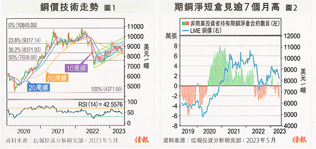 以LME的3個月期銅周線圖分析,銅價明顯失守50周線、去年7月向上伸延上升通道底線(迴歸線減兩個標準差),以及2020至2022年大升浪計算 38.2%回調支持滙聚約 8370美元,14周相對強弱指數(RSI)也挫穿50中軸又未見超賣,技術上仍有下試黃金比率 50%近 7600美元的可能【圖1】。