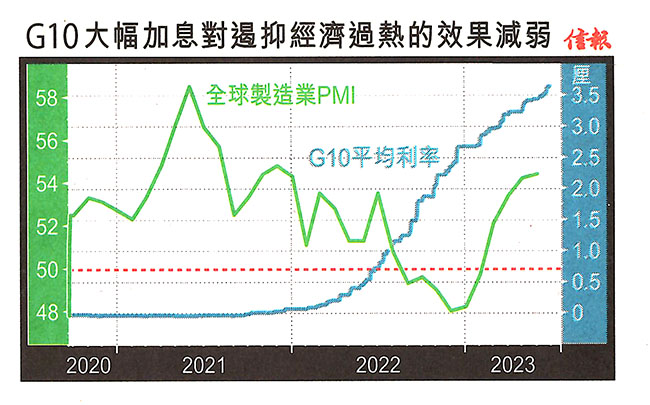 附【圖】所見,彭博綜合十國集團 (G10) 成員國平均基準利率,雖由—年前的0.7厘水平,急增到3.63厘,惟具代表性的前瞻指標之摩根大通全球製造業採購經理指數 (PMI) , 最近5月報54.4, 企穩盛衰分界50之上4個月,並屬連續6個月上揚,反映加息抑制宏觀經濟擴張,效力大不如前,物價回落難度更高。