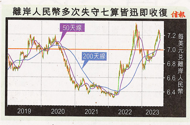 2018年中美貿易戰開打,使人民幣滙價更趨波動,附【圖】所見·離岸價(CNH)於2019年8月兌美元首度失守七算,到同年12月成功收復,於2020年和2022年都曾經「破七」,但僅3至5個月便能回穩收復;目前美元下跌空間有限,除非中央一如市場憧憬在7月底祭出重拳刺激經濟,否則只怕「今次真的不一樣」,人民幣數月內也難見七算。值得留意的是,人民幣上周回勇卻連50天線亦無法突破,而七算剛好為200天線位置,技術上構成龐大阻力。