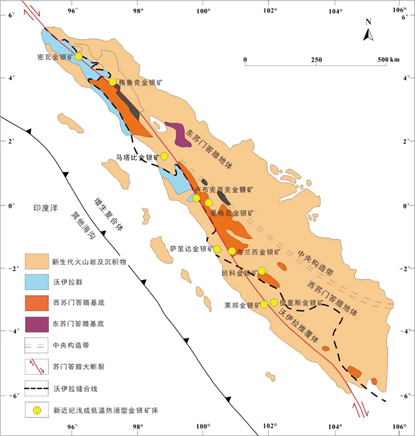 图3 印度尼西亚苏门答腊浅成低温热液型金矿床分布简图