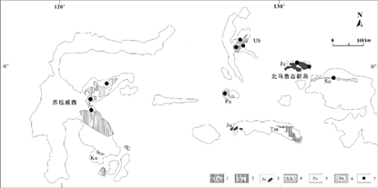 吕宋—东棉兰老岛—马鲁古群岛岛弧带在印度尼西亚主要分布在马鲁古群岛北部(图1),该区按地质特征和构造属性可划分为3部分,分别为西部火山岩、中部弧间盆地和东部构造混杂岩。区域发育与岩浆活动密切相关的铜、金、镍等矿产资源。