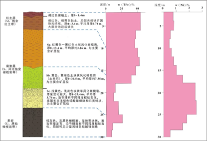 在风化壳中,镍品位在浅部红土层较低(即位于褐红土和褐黄土的上部),一般小于1.0%,而在褐黄土下部和腐岩层(即风化蚀变橄榄岩带)较高,一般在1.5%以上;与镍相反,铁在褐红土和褐黄土层中的品位较高,一般TFe含量在40%左右,而在风化蚀变橄榄岩带中较低,仅有15%左右(图5)。