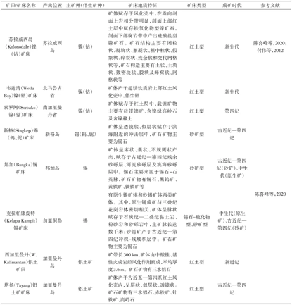 (3)补充和完善了代表性成矿带5个主要成矿期次:中二叠世—晚三叠世(265~220Ma)、早白垩世—渐新世(145~30Ma)、中新世(22~7Ma)、上新世(5.3~2.5Ma)、更新世—全新世(1Ma~至今),其典型成矿带分别为廖内群岛—邦加勿里洞锡成矿带、北加里曼丹—巴拉望铜铬镍金成矿带和中加里曼丹金铜铅锌铝成矿带、南新几内亚铜金铅锌成矿带、苏拉威西镍成矿带、马鲁古—查亚普拉镍铜成矿带。