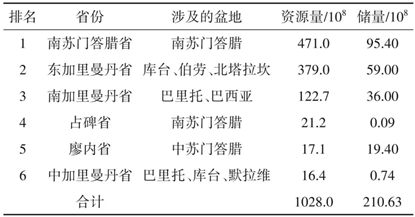 煤炭资源量超过1000×108t,储量超过200×108t。从产出构造环境看,煤炭主要赋存于新生界多个盆地中(图2),集中分布于加里曼丹岛东部以及苏门答腊岛西部和南部,煤层埋藏较浅,变质程度较低,多数可露天开采。从地理分布看,该国煤炭资源主要分布在南苏门答腊省、东加里曼丹省、南加里曼丹省、占碑省、廖内省、中加里曼丹省6省,这6省煤炭资源量和储量合计均占全国的95%以上(表3)。西苏门答腊的翁比林(Ombilin)煤矿是印度尼西亚大型煤矿之一,由日、美矿业公司联合勘查,含煤面积20647.2hm2,含煤3层,储量4.8×108t。